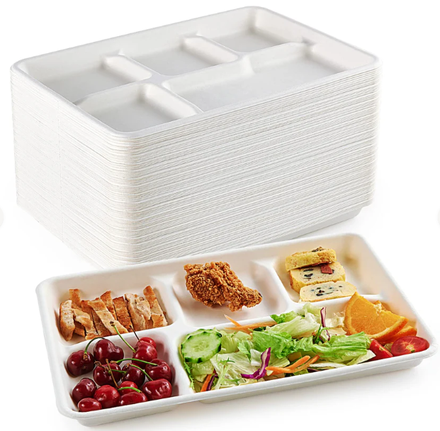 SDP Mart bagasse plates are an eco-friendly alternative to conventional plastic and Styrofoam packaging. Made from bagasse (sugarcane fiber), they are completely natural, non-toxic, BPA-free, and contain no plastic or wax. These premium disposable 5-compartment trays provide a responsible way to serve meals without sacrificing convenience or presentation. Perfect for restaurants, caterers, and sandwich shops, they are ideal for serving everything from hot entrées to cold salads.