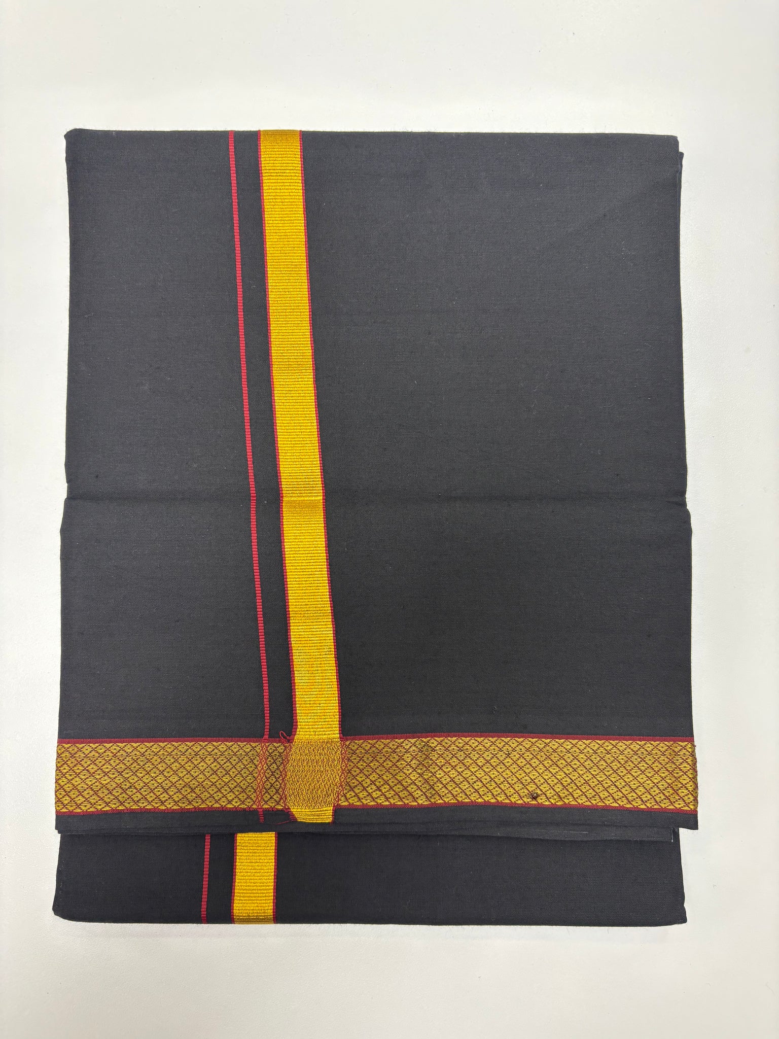• Experience the essence of tradition and grace with this men’s 100% cotton single-layer Black dhoti, adorned with a classic color/design border — a true reflection of cultural heritage and timeless style.