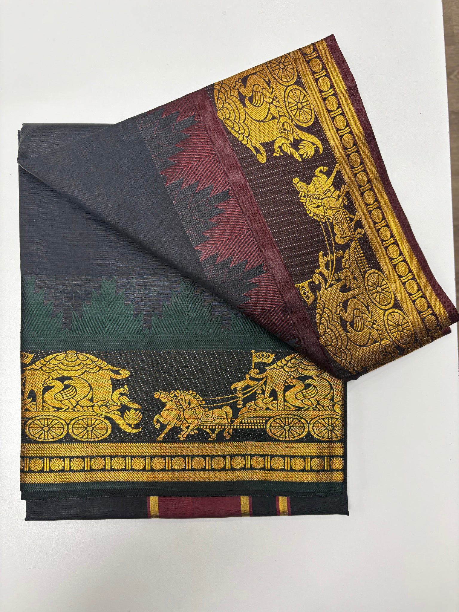 • Cotton Blend Black Dhoti/Veshti/Mundu with Gold Jari and Design Border.